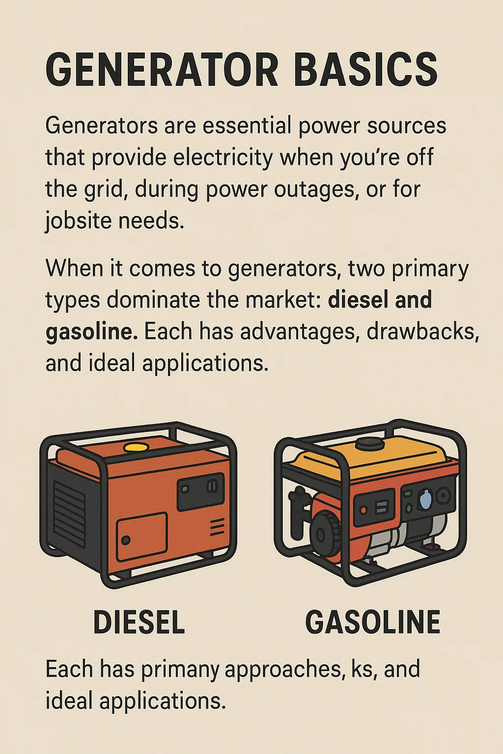 Diesel generantibus cognoscuntur pro eorum firmitate, efficacia cibus, et longi temporis spatium. Simili modo generantibus gasolino agunt, sed a pellentesque cibus excitantur, qui commoda et incommoditates suam singularem habet. Diesel generatores de more adhibentur in condicionibus in quibus diuturnum tempus, gravis officii potestas requiritur, ut popularem electionem in negotiis, magnarum molitionum inceptis, et in vivis extemporalitatem faciat.