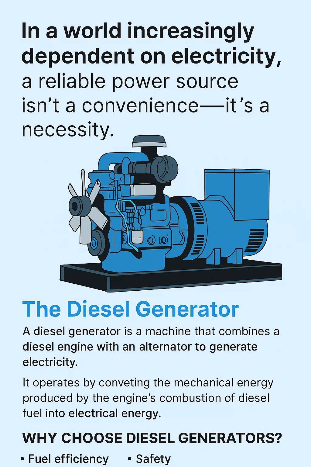 Alternator (Generator End); Haec est pars quae producit electricity . Rating alternatoris saepe in kVA quae vis apparentis generantis producere potest.
